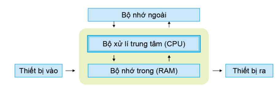 Máy tính gồm những thành phần cơ bản là: Bộ nhớ trong, bộ nhớ ngoài, CPU, thiết bị vào, thiết bị ra.