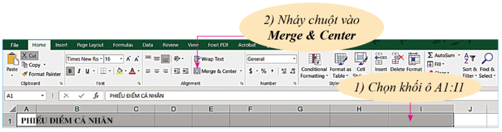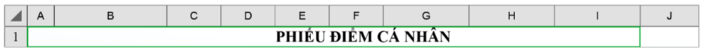 + Để căn chỉnh tiêu đề của bảng “PHIẾU ĐIỂM CÁ NHÂN” vào giữa đoạn A1:I1 như Hình 10.2a, chọn khối ô A1:I1, rồi nháy chuột vào nút lệnh