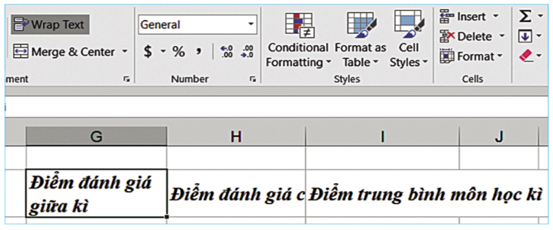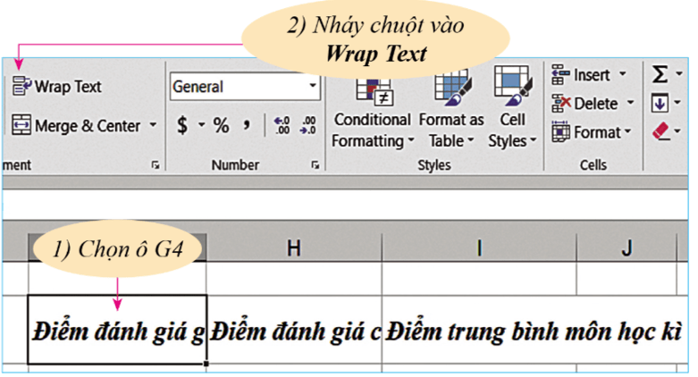 - Để tiêu đề “Điểm đánh giá giữa kì” tự động ngắt xuống dòng sau từ “giá”, cần chọn ô có nội dung đó (G4), rồi nháy chuột vào lệnh Wrap Text