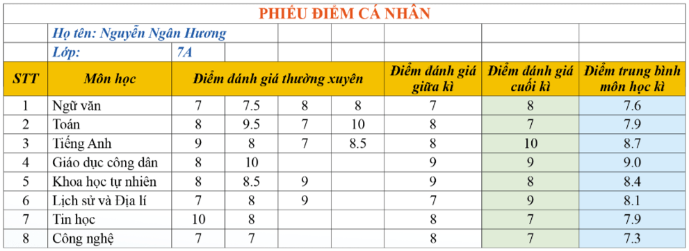Hình 10.1: Một mẫu Phiếu điểm cá nhân tạo bằng bảng tính