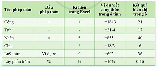 Các phép toán +, -, ×, :, trong toán học được kí hiệu trong Excel là +, -, *, / .