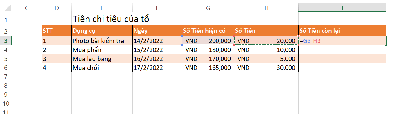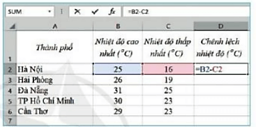 Bước 2. Gõ nhập “=B2-C2”, nhấn Enter, kết quả phép trừ là 9 xuất hiện trong ô D2.