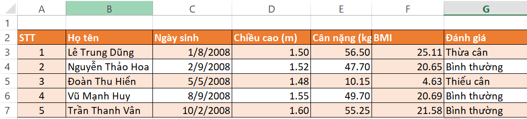 Ta lập công thức “=Cân nặng / (chiều cao * chiều cao).