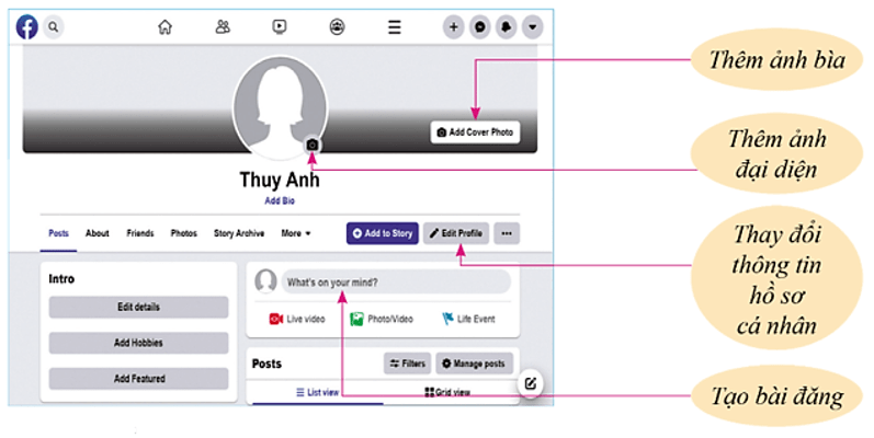 - Cập nhật thông tin cá nhân: chọn Edit Profile, thay đổi ảnh bìa, ảnh đại diện, nhập các thông tin cá nhân như nơi ở, sở thích, …
