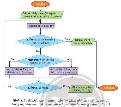 Trong thuật toán tìm kiếm nhị phân để tìm một số trong dãy thẻ số, sau bước Kiểm tra: dãy rỗng? nếu nhận kết quả Sai, ta thực hiện bước Lật thẻ số ở giữa dãy.