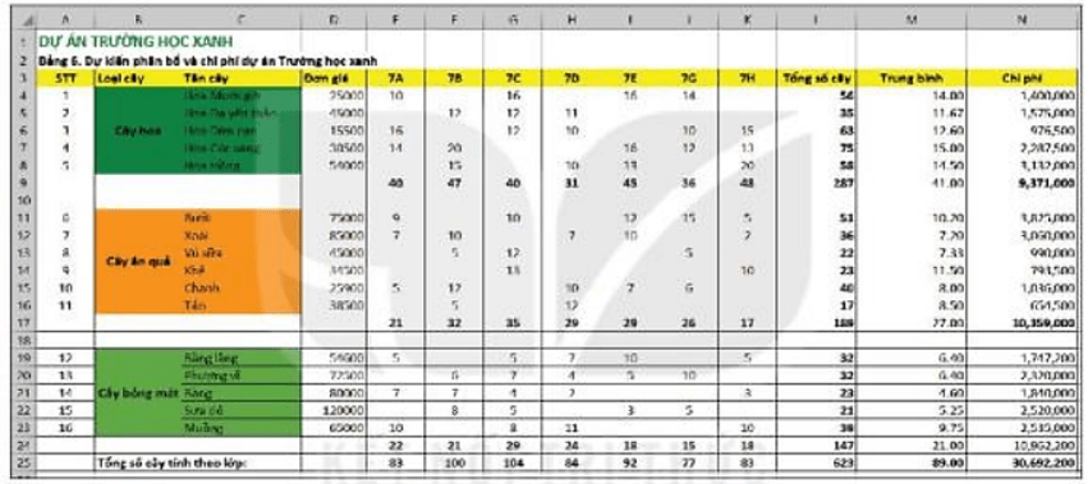 - Tô màu nền cho các ô dữ liệu theo từng loại cây.