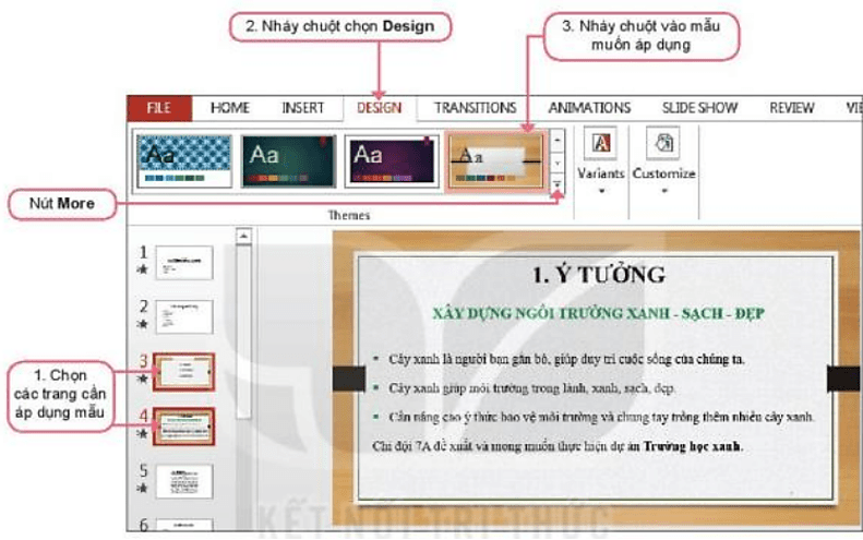 - Các mẫu định dạng hiển thị trực quan trong nhóm Themes của thẻ Design. Khi em di chuyển con trỏ chuột trên một mẫu, tên mẫu đó xuất hiện và áp dụng vào trang chiếu thể hiện ngay trên màn hình, do đó thuận tiện, dễ dàng và tiết kiệm thời gian.