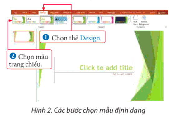 - PowerPoint cung cấp mẫu định dạng trang chiếu được thiết kế sẵn theo chủ đề với màu sắc, hình ảnh, phông chữ, kiểu chữ, cỡ chữ,... (Themes). Khi được chọn, mẫu định dạng sẽ được áp dụng cho tất cả các trang của bài trình chiếu.