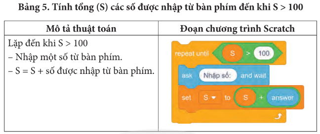 Ví dụ: dưới đây là mô tả thuật toán và đoạn chương trình Scratch tính tổng (S) các số được nhập từ bàn phím cho đến khi tổng lớn hơn 100 thì thông báo S rồi kết thúc.