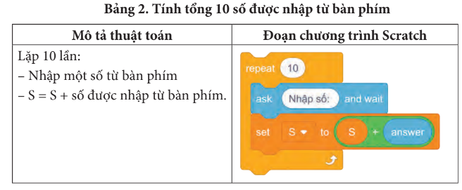 Ví dụ, dưới đây là mô tả thuật toán tính tổng S của 10 số được nhập từ bàn phím và đoạn chương trình Scratch tương ứng.