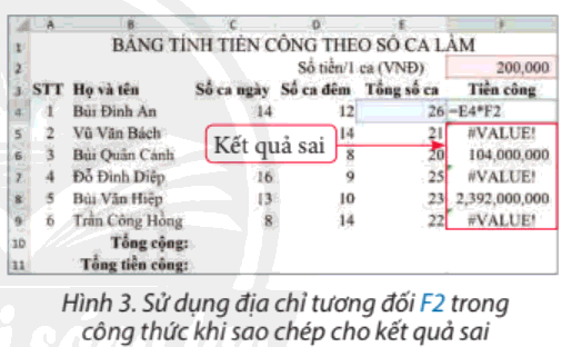 - Ở Hình 3, để tính tiền công cho người đầu tiên, tại ô tính F4 ta có thể dùng công thức =E4*F2.