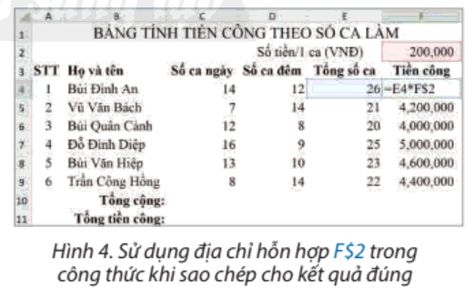 - Công thức tính “Tiền công” phải nhân “Tổng số ca” với “Số tiền/1 ca (VNĐ)” tại ô tính F2. Địa chỉ ô tính F2 không được thay đổi khi sao chép công thức.