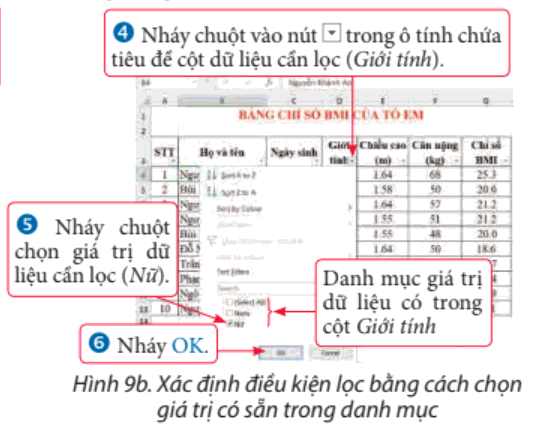 - Hình 9 hướng dẫn các bước để lọc các bạn nữ trong bảng tính ở Hình 7.