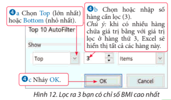 + Trong cửa sổ Top 10 AutoFilter mở ra, thực hiện các bước như ở Hình 12.
