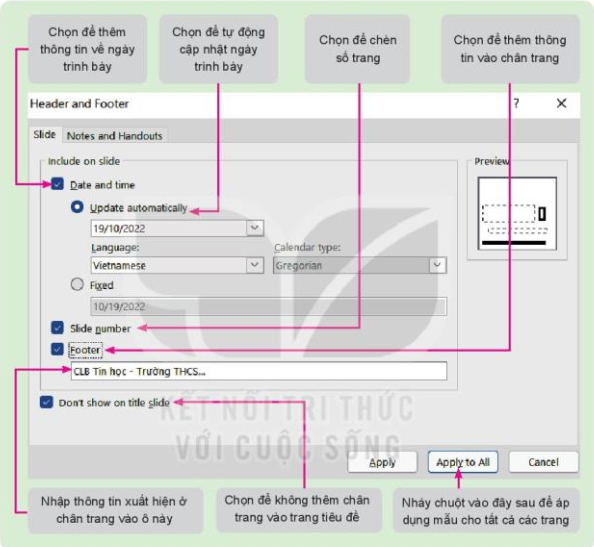 + Chọn Insert, trong nhóm lệnh Text em chọn lệnh Header & Footer hoặc Slide Number để mở cửa sổ Header and Footer và thực hiện các bước như hình dưới đây.