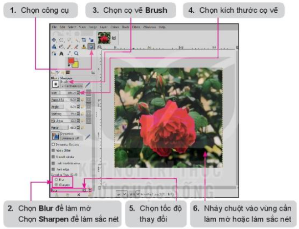 - Phần mềm xử lí ảnh cung cấp công cụ làm mờ, làm sắc nét ảnh tức là làm mờ một vùng quá nổi bật trong ảnh, làm sắc nét riêng một đối tượng hoặc làm mờ nền xung quanh ảnh để làm nổi bật chủ thể bức ảnh.