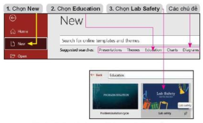 + Chọn File/New để tạo một bài trình chiếu mới. Phần mềm trình chiếu sẽ đưa ra các bản mẫu có sẵn được sắp xếp theo các chủ đề để em lựa chọn. Em chọn Education và chọn bản mẫu có tên Lab Safety.