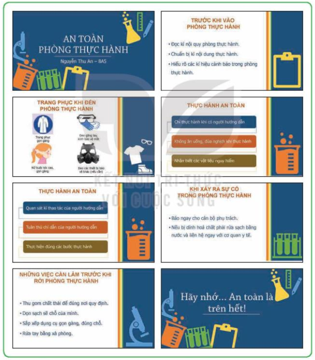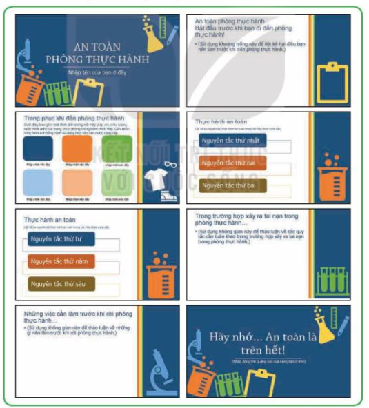 Em hãy tạo một bài trình chiếu về chủ đề An toàn trong phòng thực hành (phòng thực hành Tin học, thực hành Khoa học tự nhiên,…) với các yêu cầu sau: