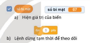 + Cách thứ hai: Chạy thử với dữ liệu mẫu để dò lỗi. Vì là người lập trình, em có thể cho hiện giá trị các biến số bí mật và số lần đoán bằng cách đánh dấu 0 vào bên cạnh các biến đó trong nhóm “Các biến số” (Hình a).