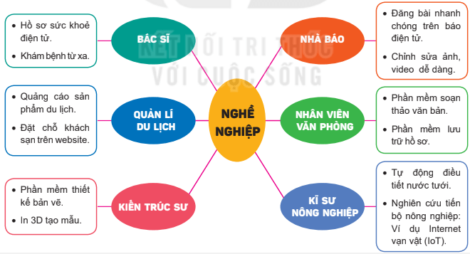 - Thông qua sự phát triển của tin học, hàng loạt các lĩnh vực nghề nghiệp được hỗ trợ hiệu quả, nâng cao chất lượng công việc đã tạo ra những nghề nghiệp đa dạng như: phát triển phần mềm, lập trình ứng dụng điện thoại, quản trị mạng, phát triển và thiết kế website,… Bên cạnh đó, một số nghề cũng rất phát triển như: bán hàng online, streamer (phát sóng trực tiếp cho người xem thông qua một nền tảng online), vlogger (tạo dựng nội dung trên nền tảng video và đăng trên các mạng xã hội).