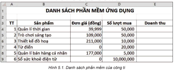 - Ví dụ, chúng ta tính Doanh thu của mỗi phần mềm ở Hình 5.1 theo công thức: Doanh thu = Đơn giá x số lượt mua