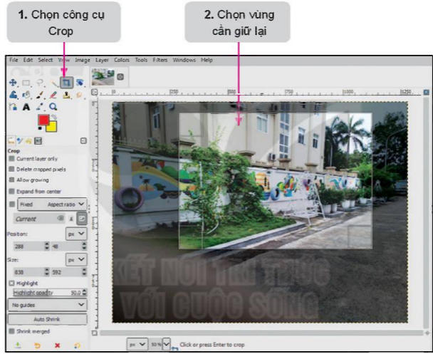 Em thực hiện các bước theo hướng dẫn trong hình bên dưới. Nhấn phím Enter để hoàn thành. Lưu lại ảnh với tên tệp là Anh_Crop.xcf.