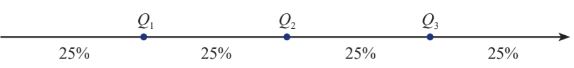 \({Q_1},{Q_2},{Q_3}\), nó chia mẫu số liệu đã sắp xếp theo thứ tự từ nhỏ đến lớn thành 4 phần, mỗi phần đều chứa 25% giá trị.