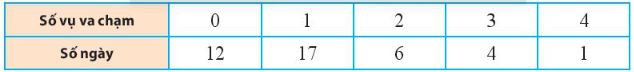 Số ngày có 1 vụ va chạm là 17, lớn hơn số ngày có 0, 2, 3, 4 vụ va chạm. Do đó mẫu số liệu trên có M0 = 1.