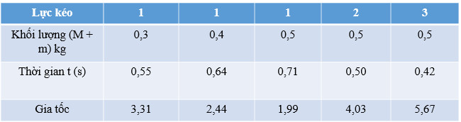 \(s = {v_o}.t + \frac{1}{2}.a.{t^2}\) (đặt xe trượt có gắn tấm chắn súng sao cho tấm chắn này sát với cổng quang điện 1 để Vo = 0; s = 0,5 m là khoảng cách giữa hai cổng quang điện trong thí nghiệm). Đo thời gian ứng với mỗi lần thử nghiệm, ta tỉnh được: