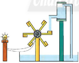 Nước được đưa lên bình chứa, sau đó chảy từ trên cao xuống làm quay tuabin của máy phát điện và làm sáng bóng đèn.