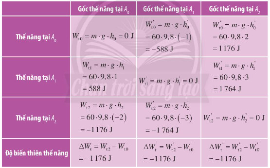 Gọi thế năng tại A0, A1, và A2 lần lượt là Wt0, Wt1, và Wt2. Chọn chiều dương thẳng đứng hướng lên. Thế năng tại các điểm đang xét và độ biến thiên thế năng giữa hai điểm A2 và A0 được cho ở bảng dưới đây.