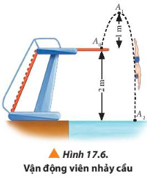 Ví dụ: Xét một vận động viên nhảy cầu có khối lượng 60 kg bắt đầu giậm nhảy từ cầu có độ cao 2 m so với mặt nước (Hình 17.6). Độ cao cực đại mà người này có thể đạt được là 1 m tính từ cầu nhảy. Lấy gia tốc trọng trường g = 9.8 m/s2. Chọn chiều dương hướng lên và gốc thế năng lần lượt tại các vị trí A0, A1, và A2)