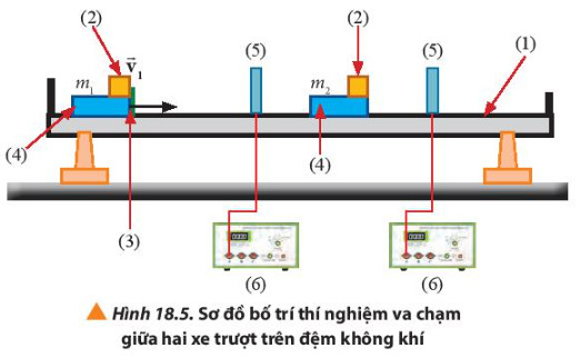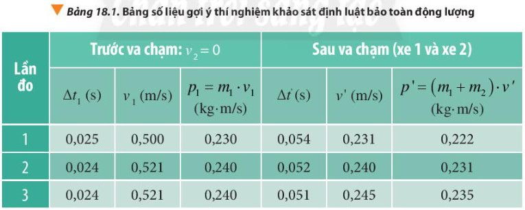 - Bước 2: Đo tổng khối lượng của xe 1 và xe 2 sau khi đã gắn miếng dính và tấm chắn cổng quang điện, ghi vào bảng số liệu như gợi ý trong Bảng 18.1.