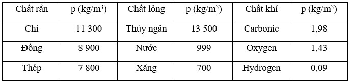 Bảng 34.1. Khối lượng riêng của một số chất ở điều kiện bình thường về nhiệt độ và áp suất
