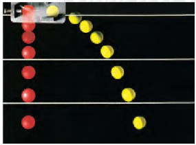 Hình 9.2. Ảnh chụp hoạt nghiệm tại nhiều thời điểm khác nhau khi thả viên bi màu đỏ rơi tự do và bắn viên bi màu vàng theo phương ngang |