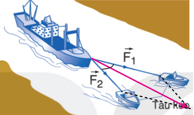 - Tàu chở hàng sẽ chuyển động theo hướng của lực tổng hợp (mũi tên màu hồng) được xác định theo hai lực thành phần