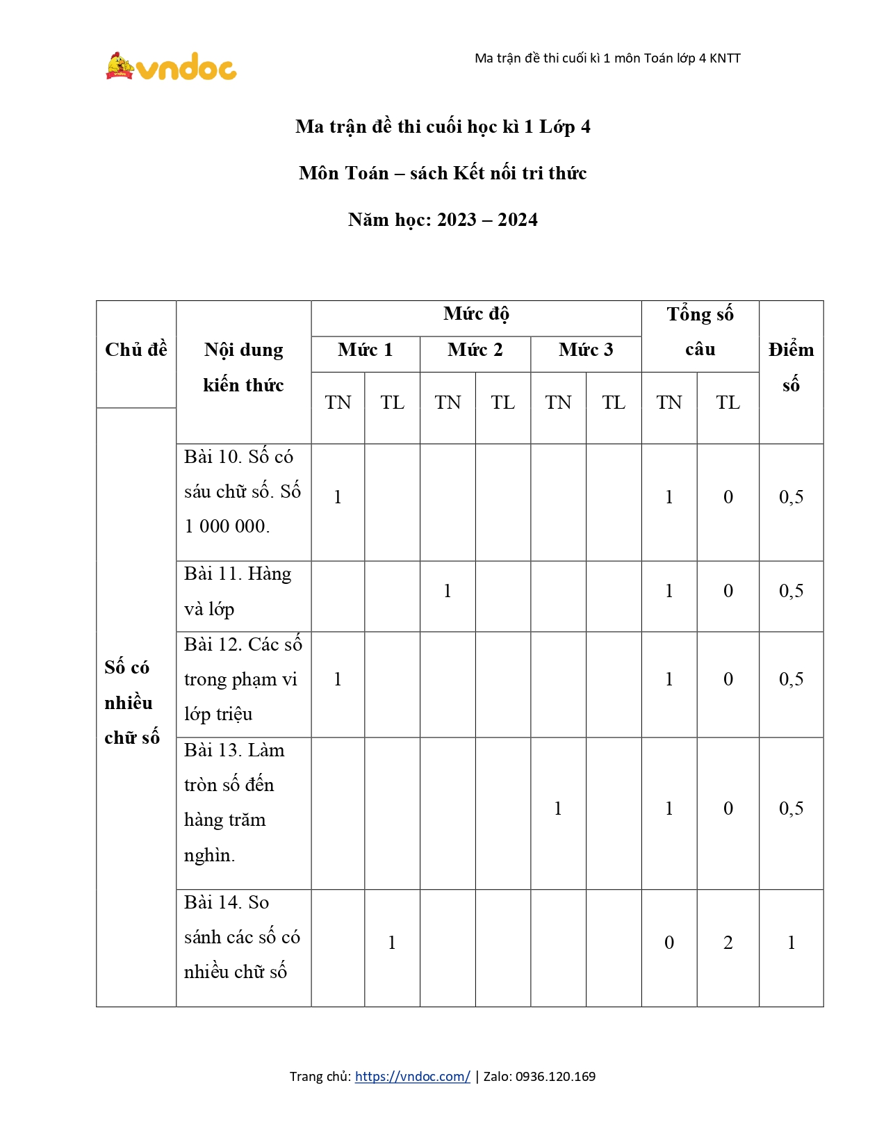 Ma trận Đề thi cuối học kì 1 môn Toán lớp 4 Kết nối tri thức