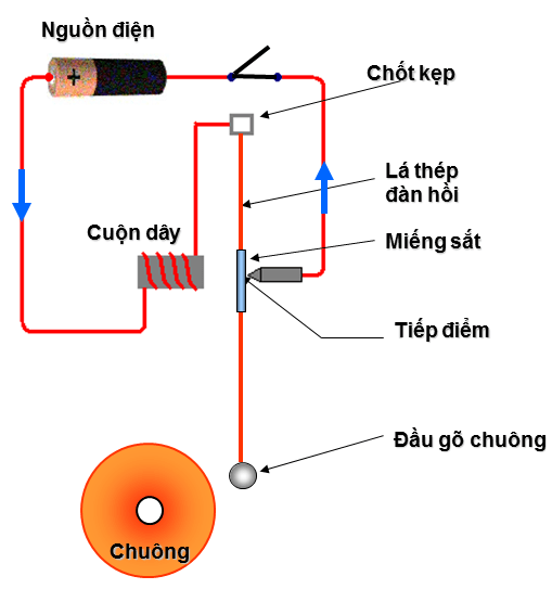 Chuông điện là thiết bị ứng dụng hoạt động của nam châm điện. Khi có dòng điện chạy qua, chuông sẽ phát ra âm thanh để báo hiệu.