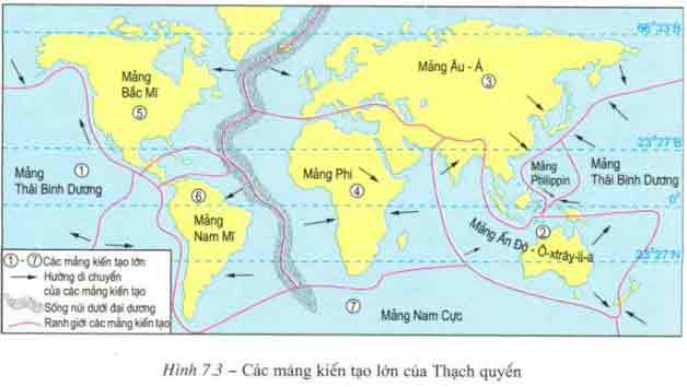 Dựa vào hình 7.3, cho biết 7 mảng kiến tạo lớn là những mảng nào?