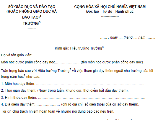 Từ ngày 14/02/2025, giáo viên đang dạy học tại các nhà trường tham gia dạy thêm ngoài nhà trường phải báo cáo với Hiệu trưởng về môn học, địa điểm, hình thức, thời gian tham gia dạy thêm. Dưới đây là Mẫu báo cáo của giáo viên đang dạy học tại cơ sở giáo dục tham gia dạy thêm ngoài nhà trường.