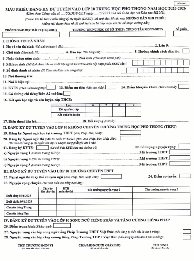 Mẫu phiếu đăng ký dự tuyển lớp 10 của Hà Nội năm 2025 - 2026