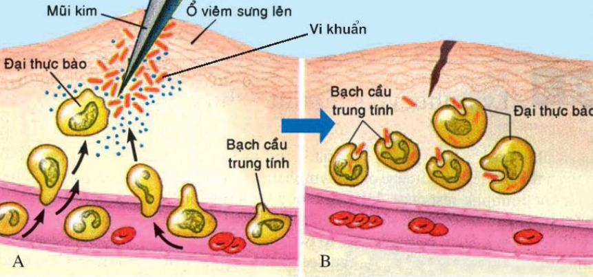 - Tế bào thực bào có chức năng tiêu diệt mầm bệnh bằng cách bao trọn, hấp thụ, sau đó nghiền nát và ăn các phần còn sót lại của mầm bệnh;