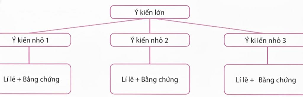 Trong văn bản nghị luận, bên cạnh ý kiến lớn (quan điểm chính mà người viết muốn thuyết phục người đọc), còn có những ý kiến nhỏ nêu ra để bổ trợ cho ý kiến lớn. Mối quan hệ giữa ý kiến lớn, ý kiến nhỏ, lí lẽ và bằng chứng trong văn bản nghị luận được thể hiện qua sơ đồ sau: