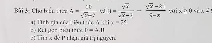 Cho A = 10/√x+7 và B = √x / √x-3 - √x - 21 / 9-x