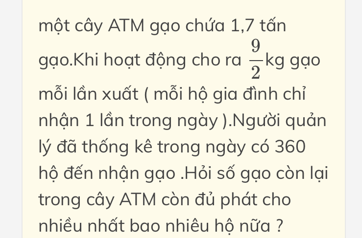 . Khi hoạt động cho ra 9/2kg gạo mỗi lần xuất (mỗi hộ gia đình chỉ nhận 1 lần trong ngày). Người quản lí đã thống kê trong ngày có 360 hộ đến nhận gạo. Hỏi số gạo còn lại trong cây ATM còn đủ phát cho bao nhiêu hộ gia đình nữa?