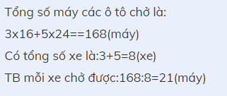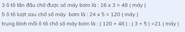 một công ty chuyển máy bơm bằng ô tô.Lần đầu có 3 ô tô,mỗi ô tô chở 16 máy.Lần sau có 5 ô tô ,mỗi ô tô chở được 24 máy.Hỏi trung bình mỗi ô tô chở được bao nhiêu máy bơm.