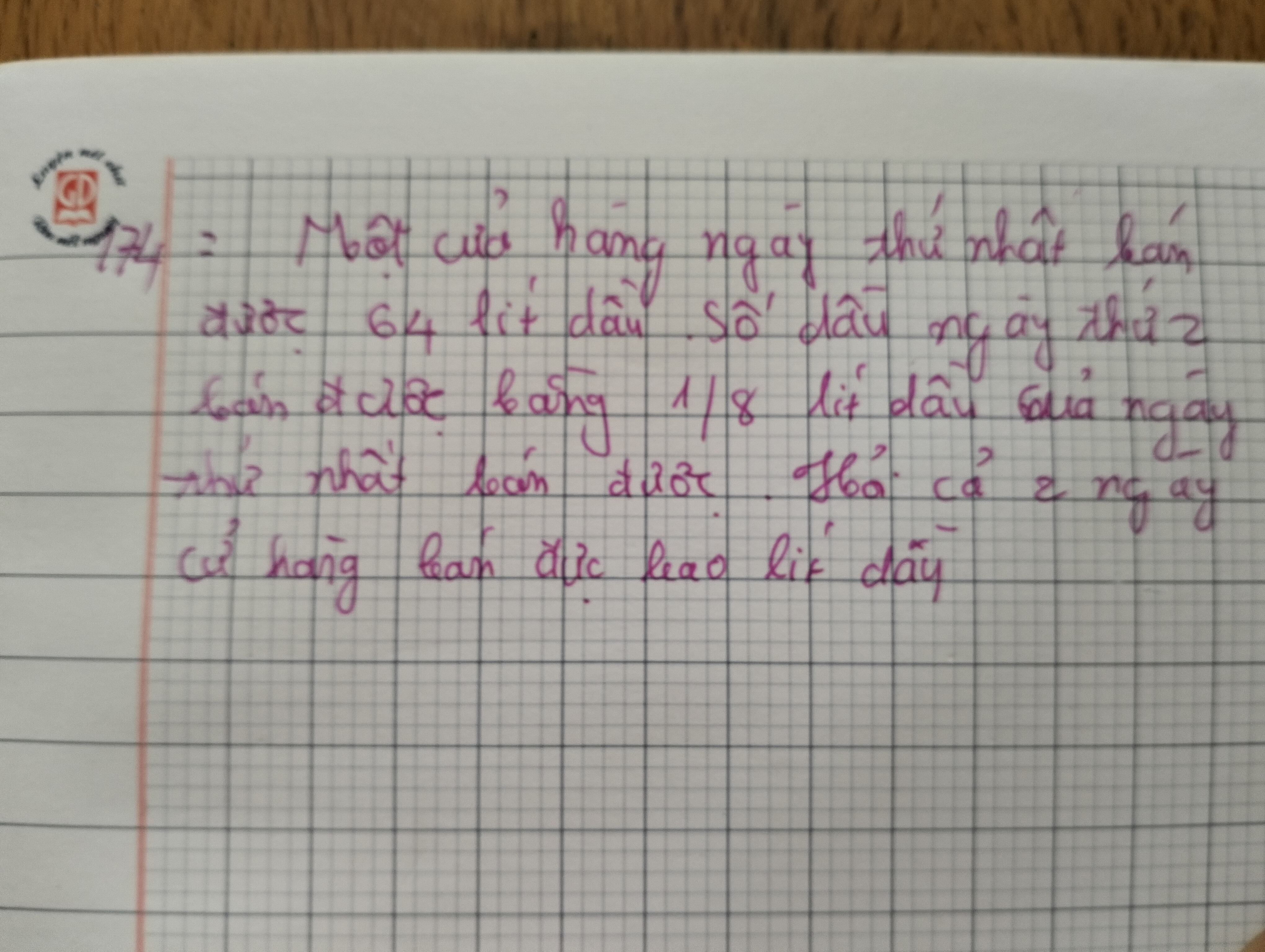 được bằng 1/8 l dầu của ngày thứ nhất bán được hỏi cả hai ngày cửa hàng đó bán được bao nhiêu lít dầu