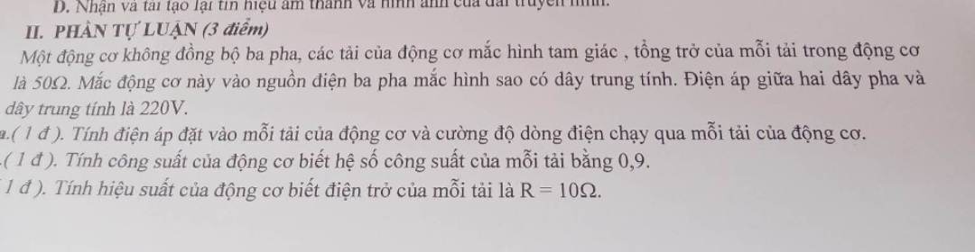 , tổng trở của mỗi tải trong động cơ là 50n. Mắc động cơ này vào nguồn điện ba pha mắc hình sao có dây trung tính. Điện áp giữa hai dây pha và dây trung tính là 220V