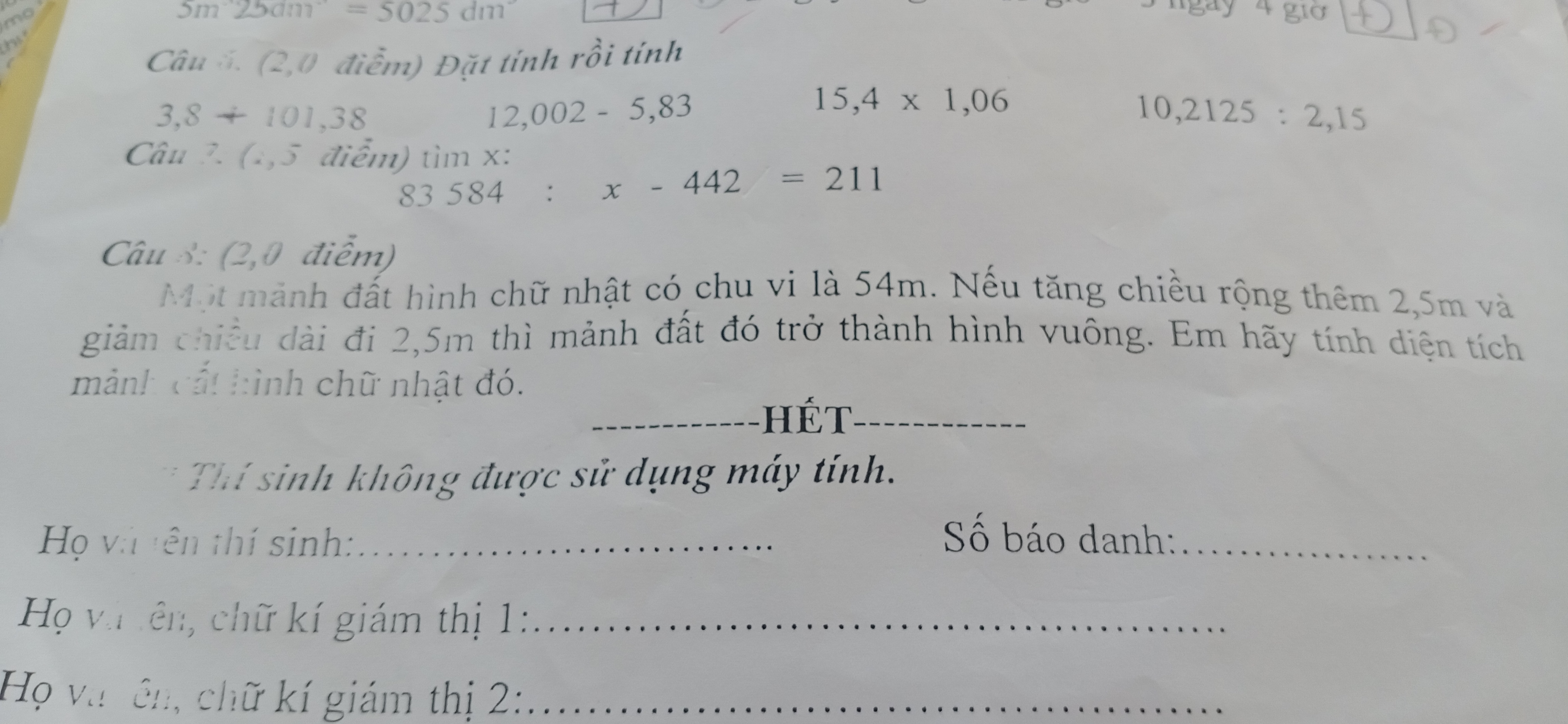 và giảm chiều dài 2,5m thì hình chữ nhật sẽ trở thành hình vuông. Tính diện tích hình chữ nhật?
