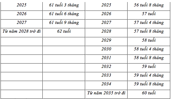 2. Lộ trình điều chỉnh tuổi nghỉ hưu của người lao động quy định tại Khoản 1 Điều này được thực hiện theo bảng dưới đây: